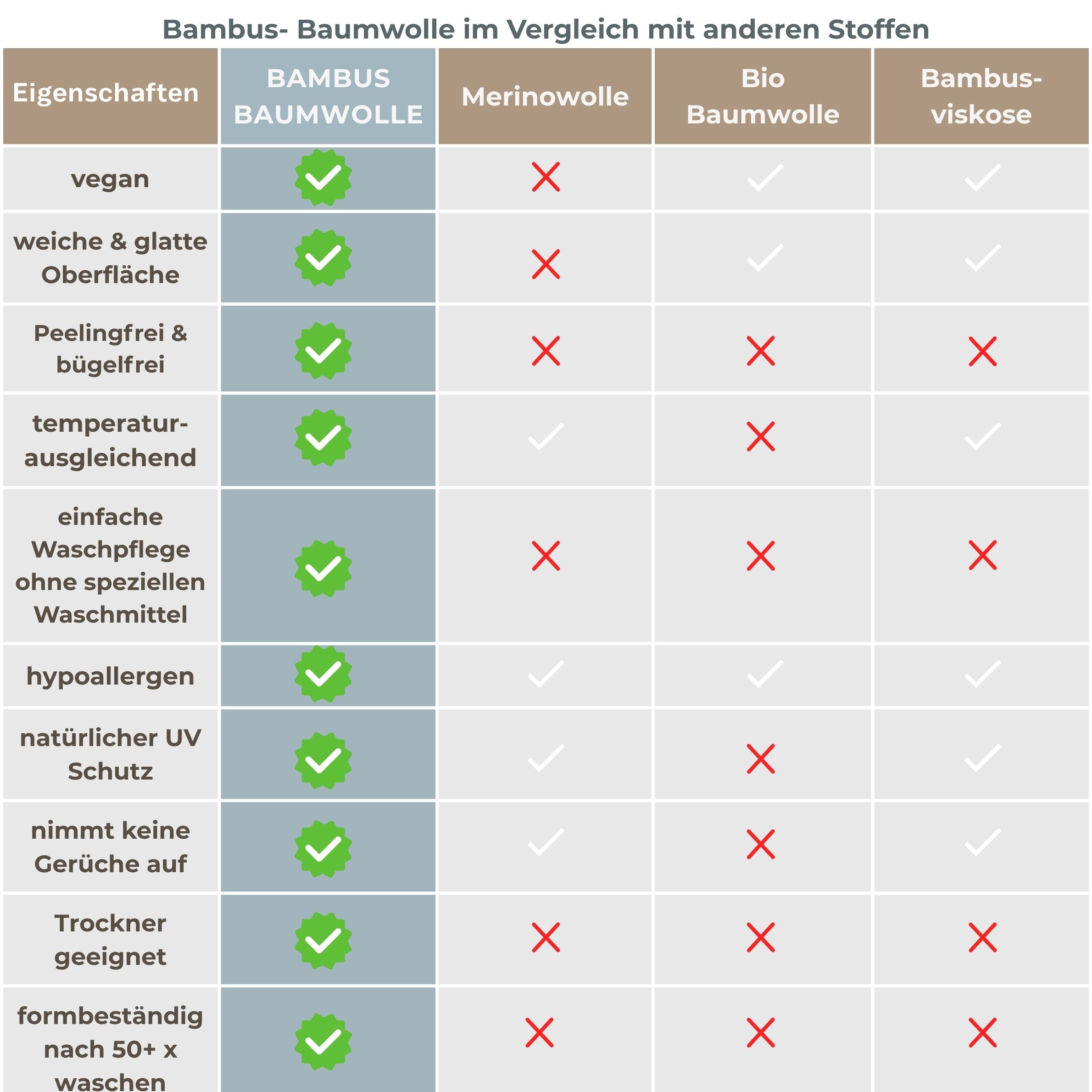 Bambus-Baumwolle vereint das Beste aus zwei Materialien. Sie kombiniert die außergewöhnliche Weichheit und Atmungsaktivität des Bambus, mit der Stabilität und Pflegeleichtigkeit der Baumwolle. Und das ist noch nicht alles!